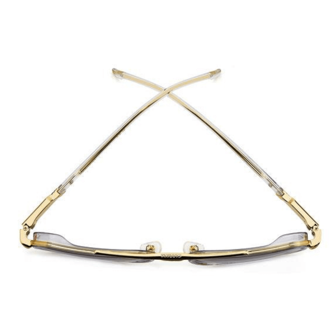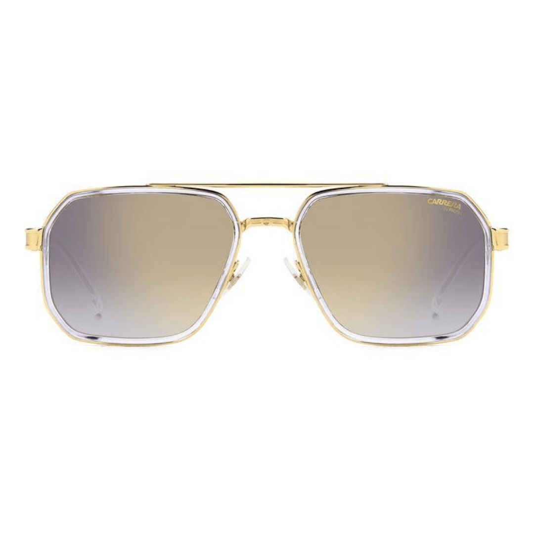 Gafas de sol masculinas hechas en acero color cristal dorado, con forma heptagonal y lentes espejo dorado sombreado gris.