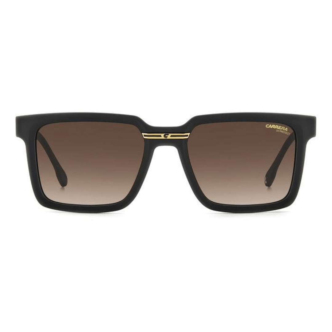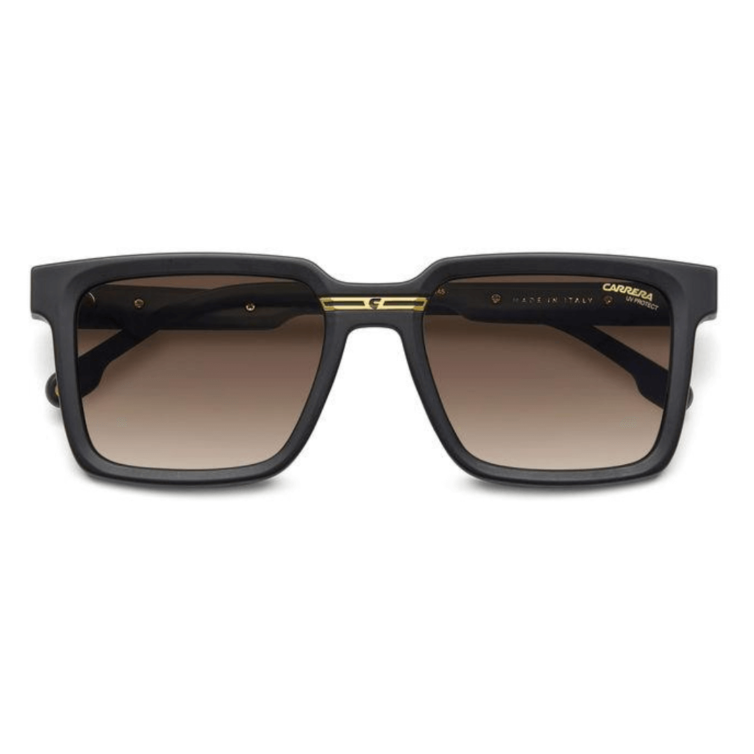Gafas de sol masculinas con forma rectangular, hechas en  acetato color negro mate con detalles en dorado y con lentes marrón verdes antireflex.