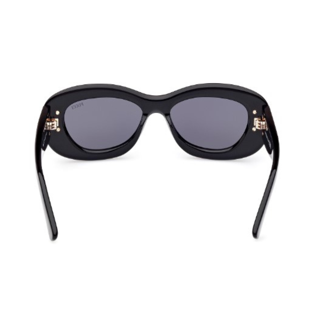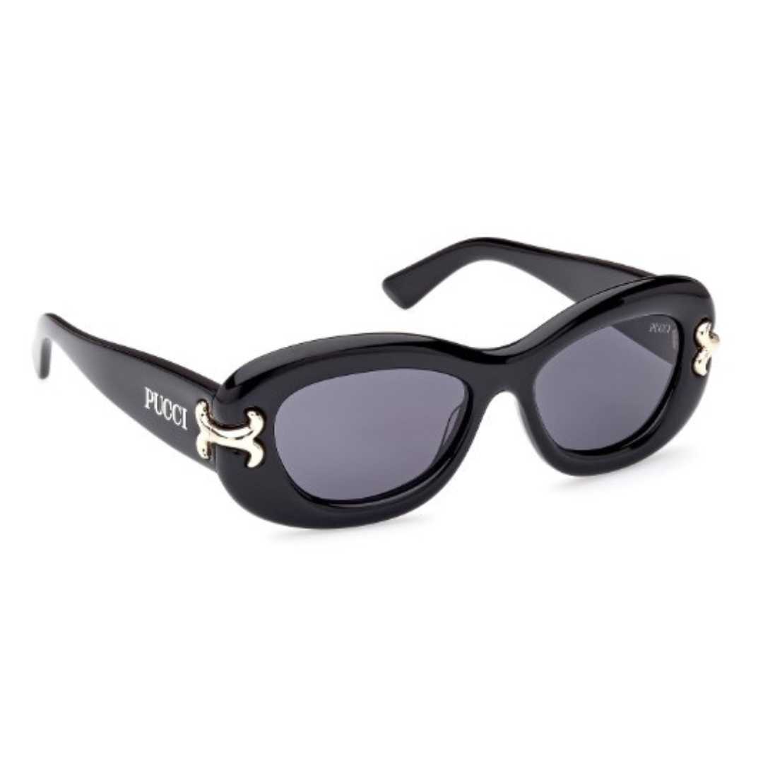Gafas de sol Emilio Pucci en acetato negro, forma cat eye y lentes con índice de protección 3. Modelo publicidad 2023 en color 42N.