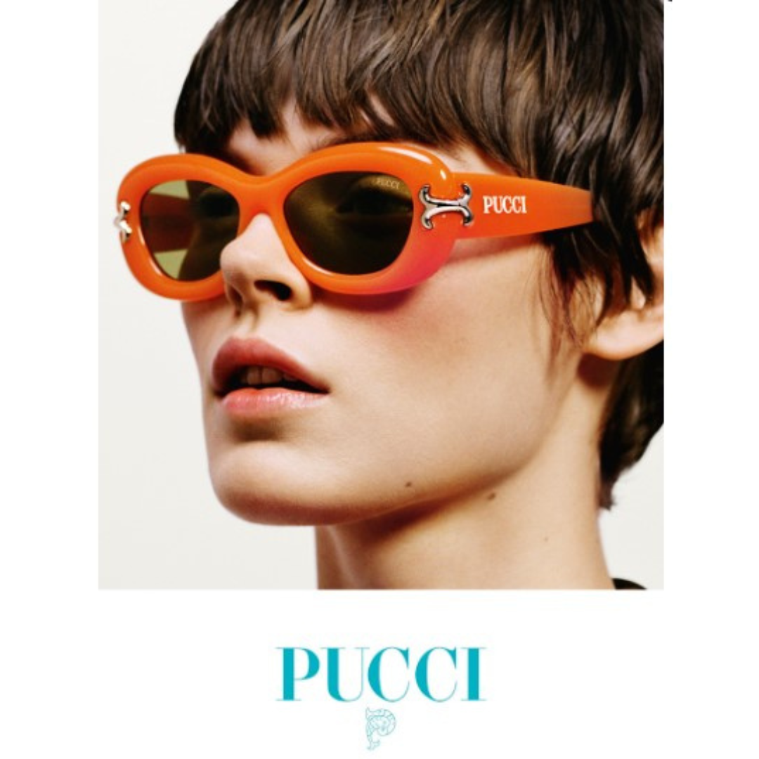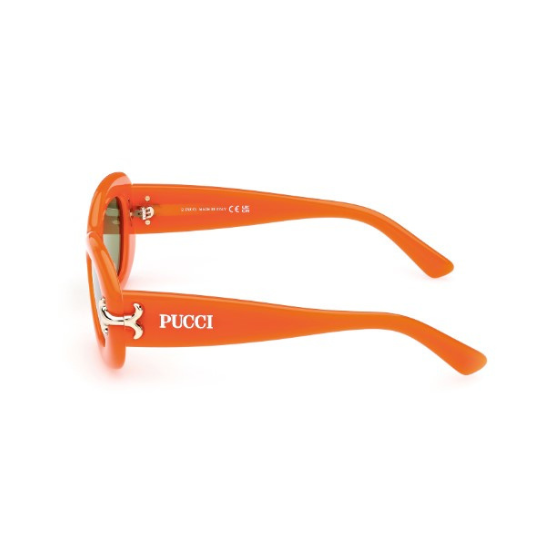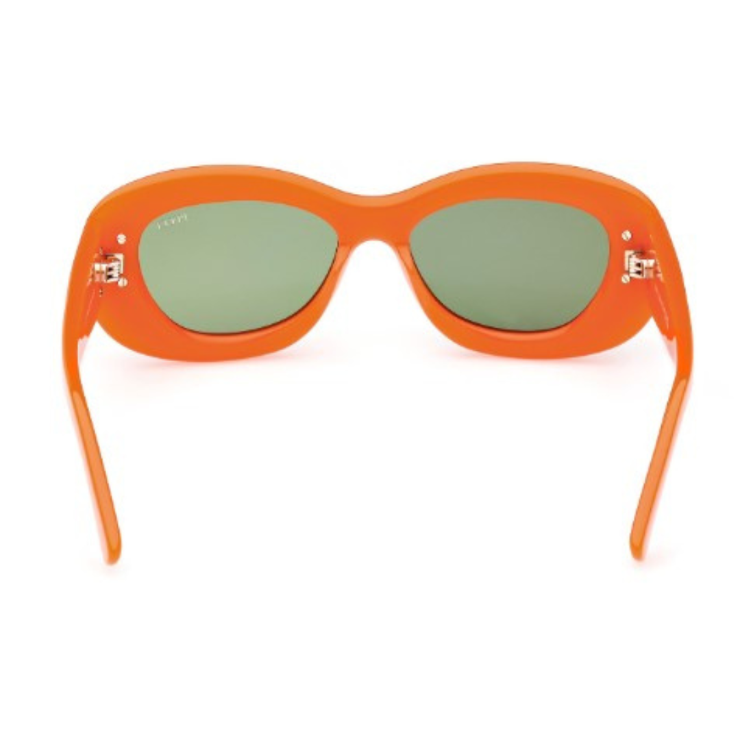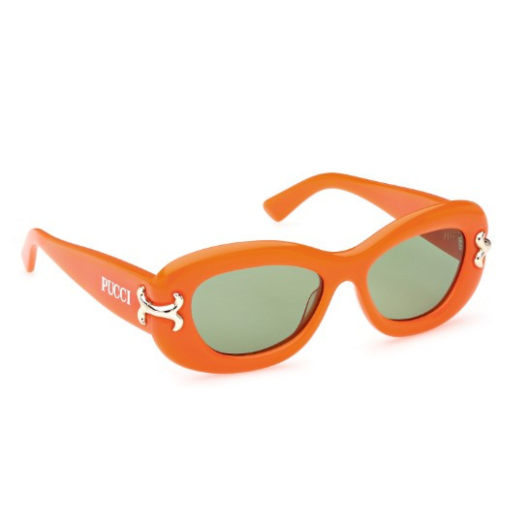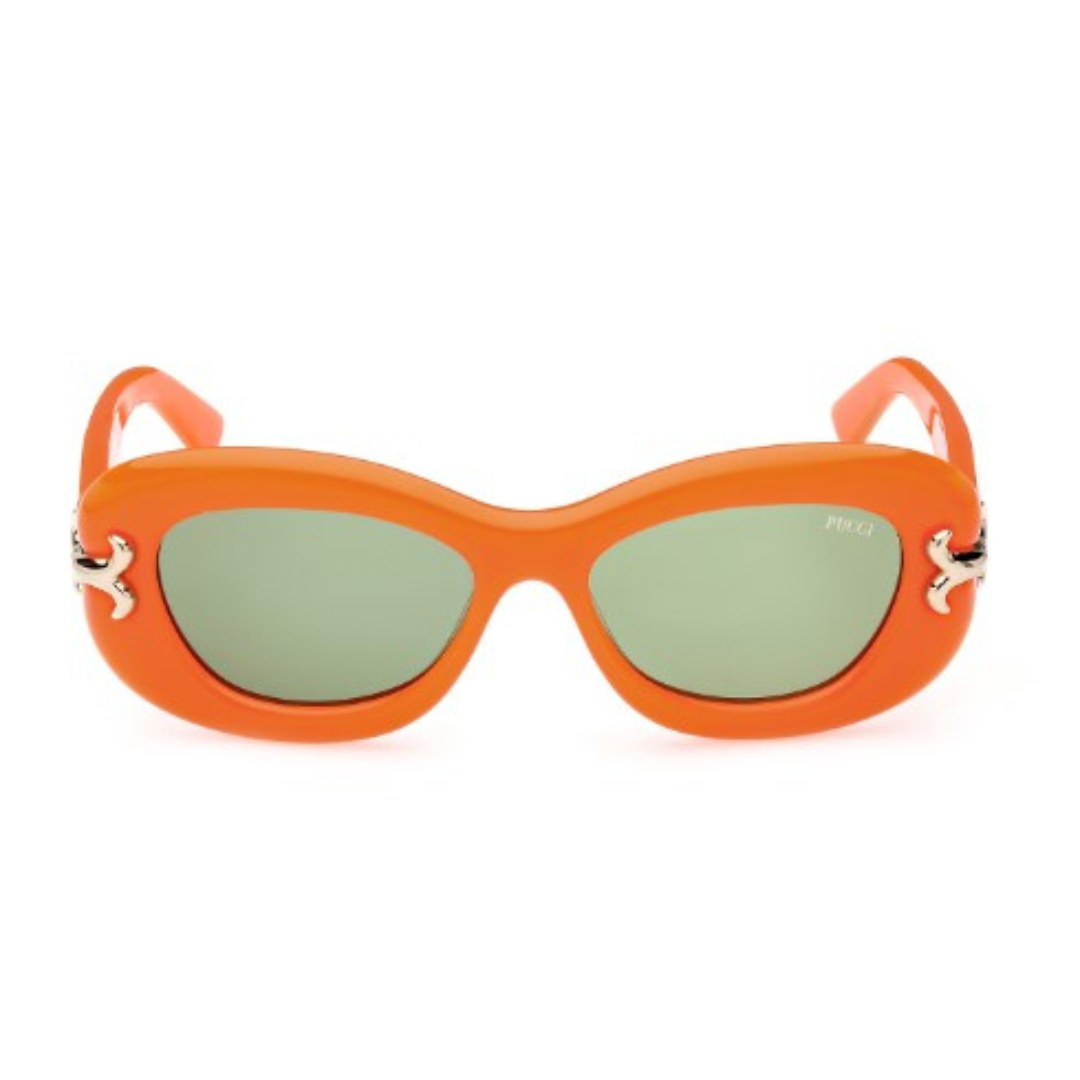 Gafas de sol Emilio Pucci hechas en acetato naranja, forma cat eye y lentes con índice de protección 2. Modelo publicidad 2023.