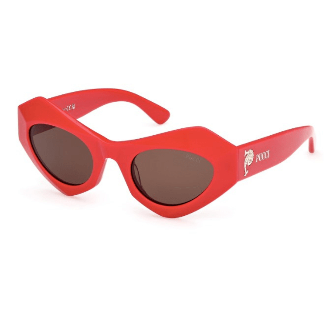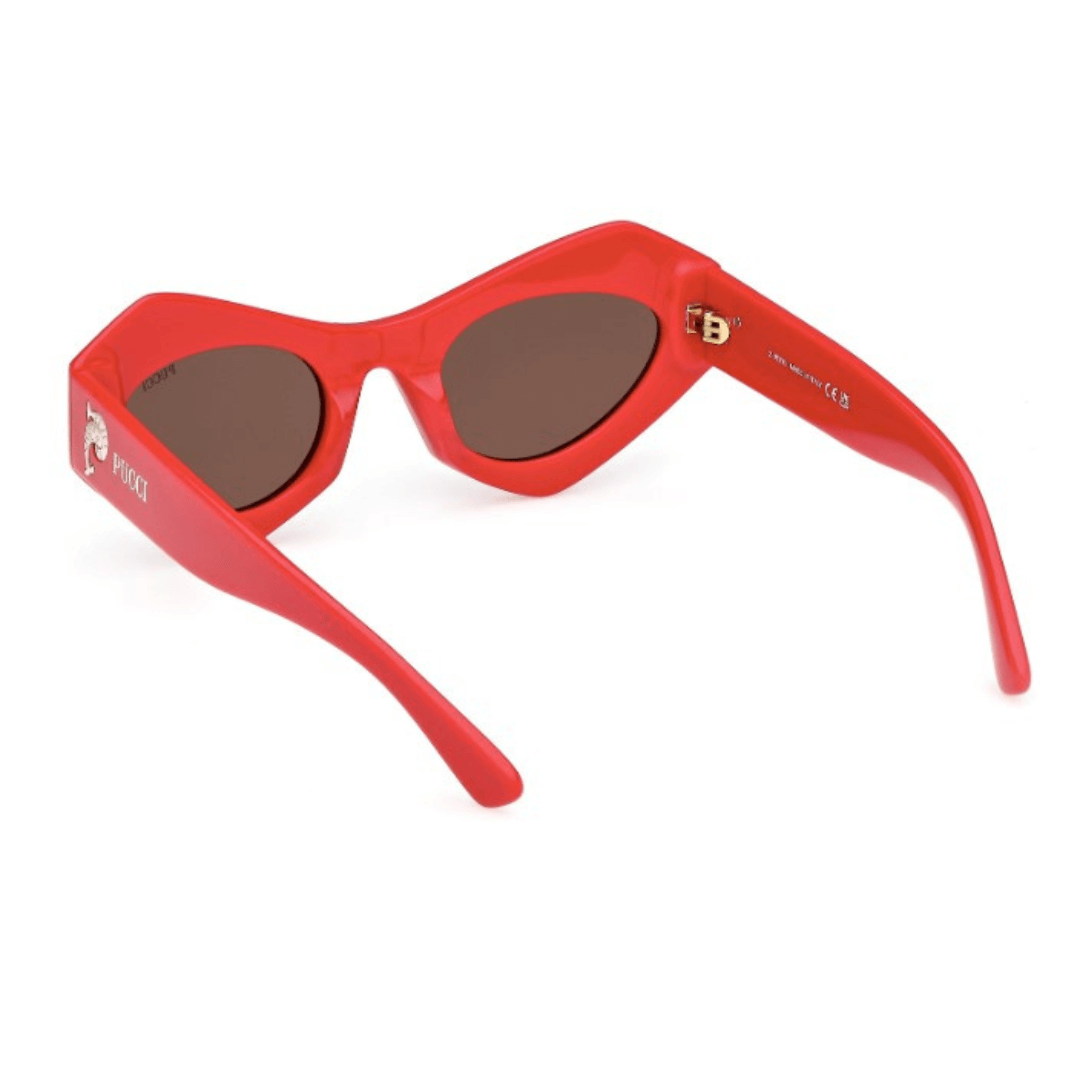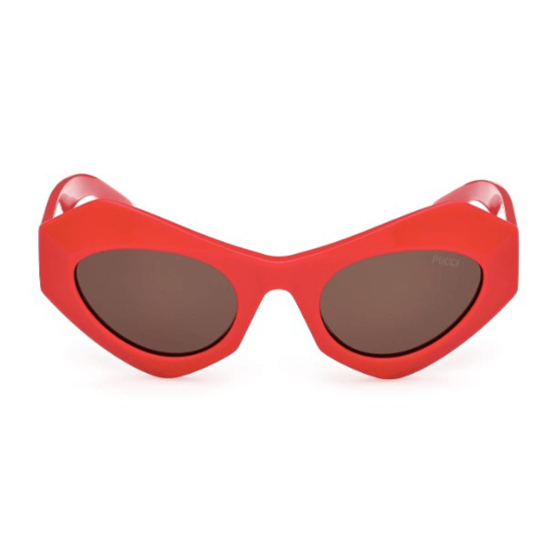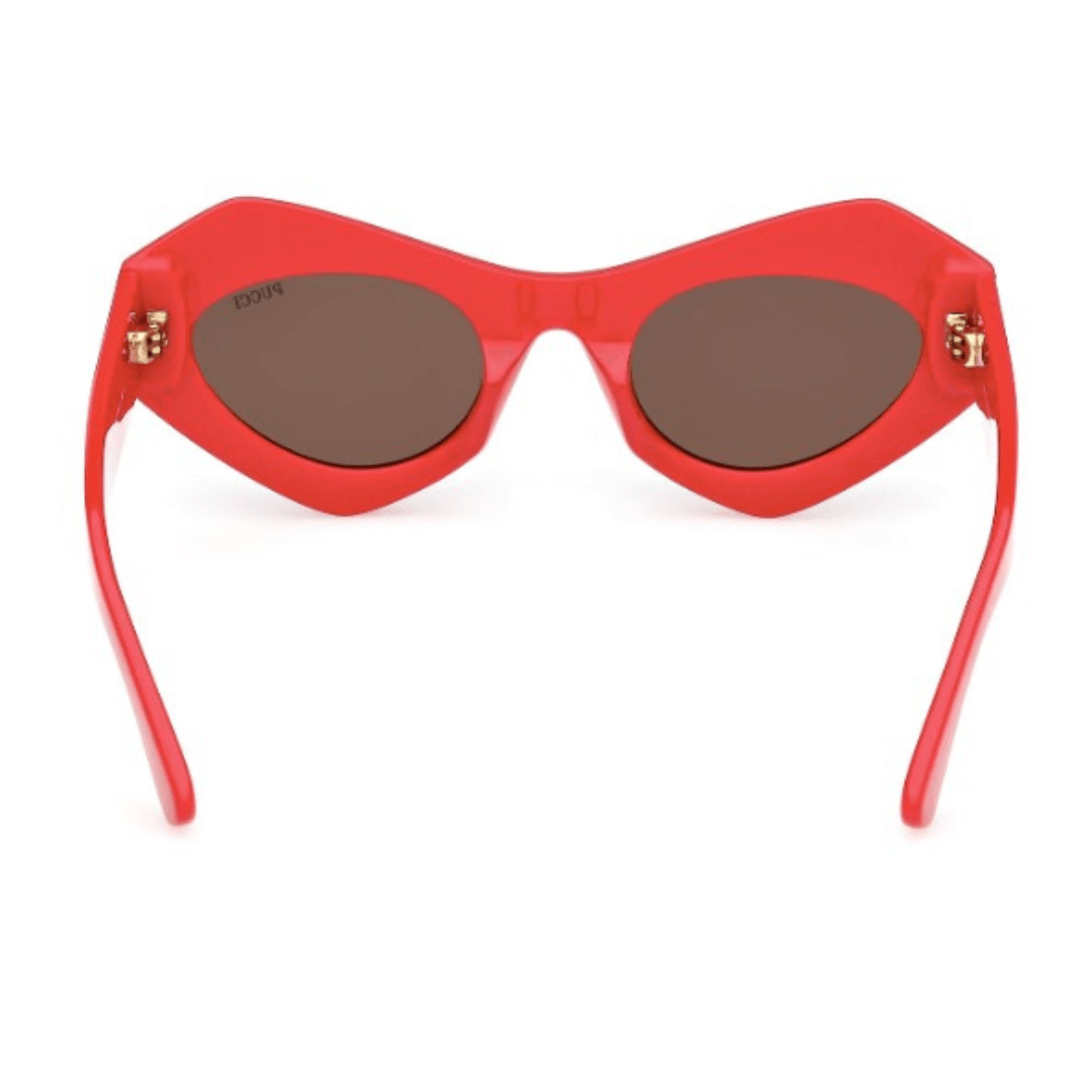Gafas de sol Emilio Pucci hechas en acetato rojo, forma car-eye y lentes con índice de protección 3. Modelo Publicidad 2024.