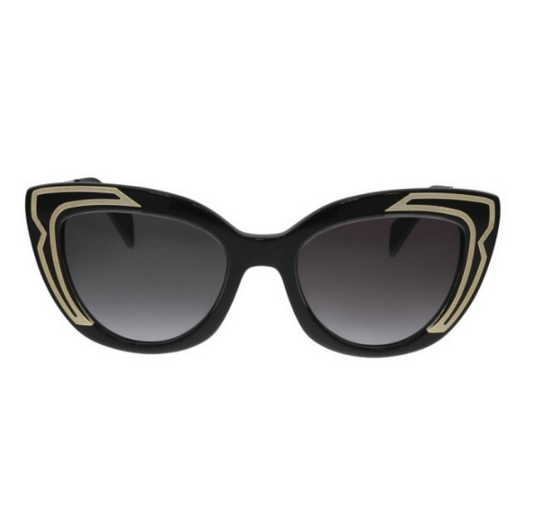 Gafas de sol femeninas. Su mezcla de metal dorado destaca sobre el acetato negro brillante, para un look elegante.