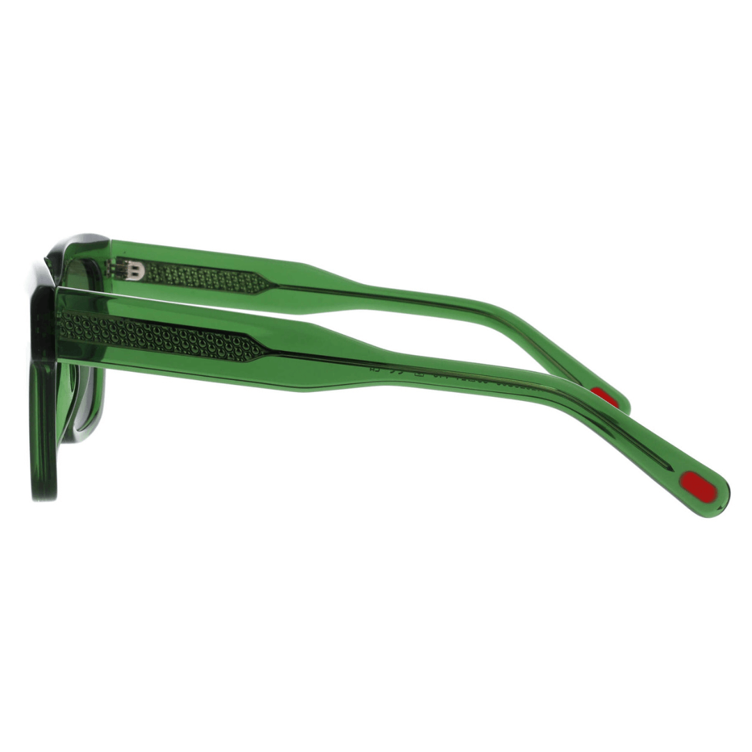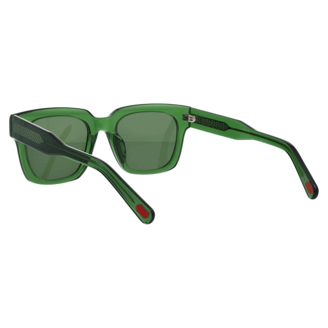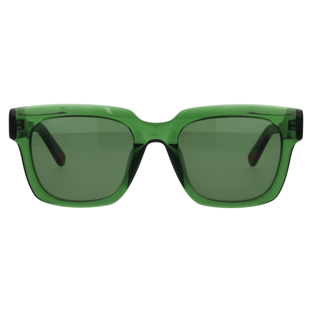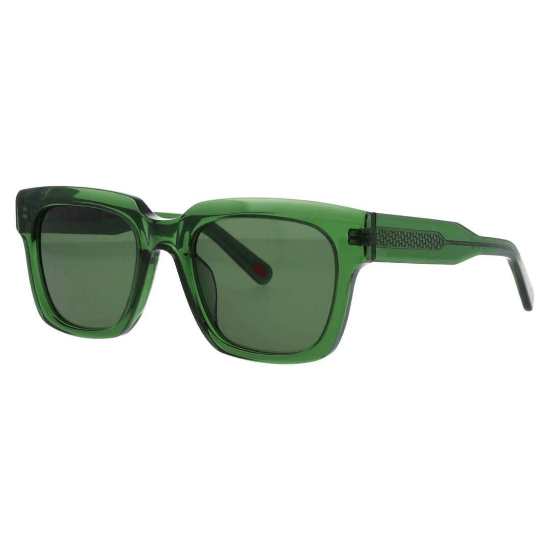 Gafas de sol Kartell hechas en acetato transparente de color verde, forma rectangular y lentes con índice de protección 3.