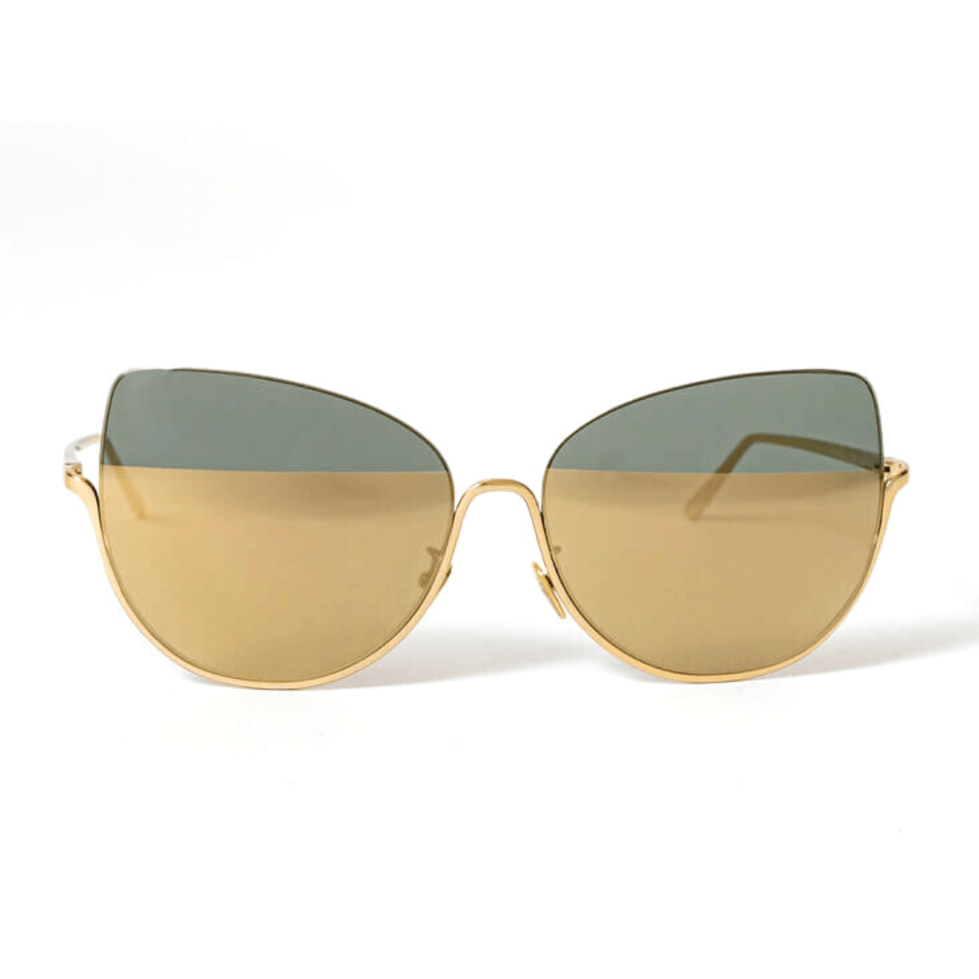 Gafas de sol metálicas en color oro con forma cat-eye y lentes a dos colores: gris y dorado.