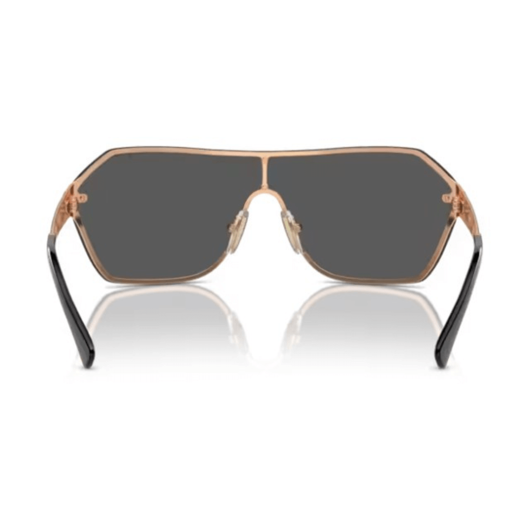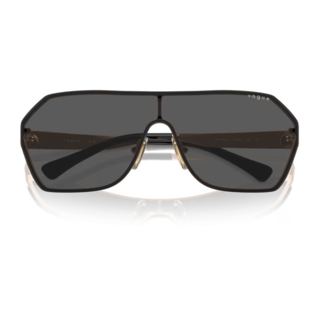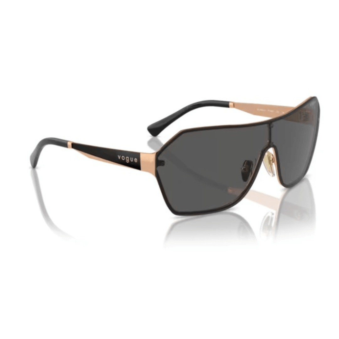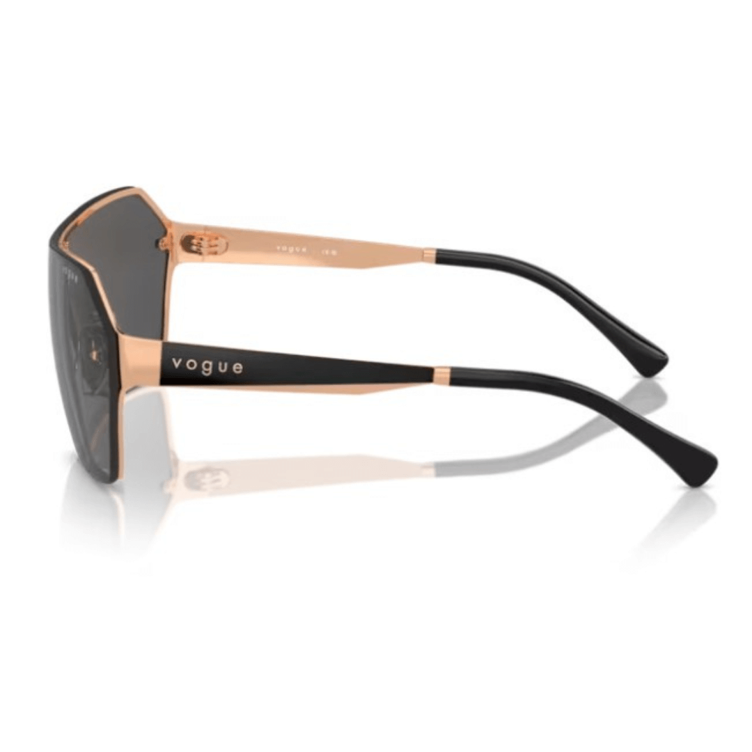 Gafas de sol Vogue en pantalla de color oro rosa y gris oscuro, varillas con combinaciones de colores en tonos mates y metálicos.